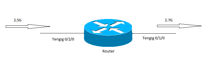 Die SIP-Karte unterstützt die Klassifizierung und Pufferung von Eingangspaketen, um eine Überbelegung zu ermöglichen. Identifizieren Sie die Eingangs- und Ausgangsschnittstellen für den Datenverkehrsfluss. Wenn der Router über eine Eingangsverbindung mit hoher Bandbreite verfügt, die Pakete mit Leitungsgeschwindigkeit und eine Ausgangsverbindung mit niedriger Bandbreite empfängt, wird eine Pufferung am Eingangs-SIP verursacht.