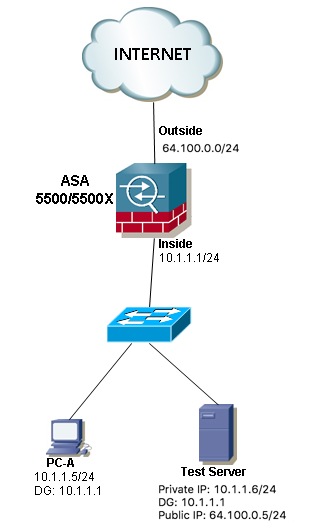 Hinweis: Der Testserver in den drei Images verfügt über eine statische Network Address Translation (NAT), die in der ASA konfiguriert ist. Diese statische NAT-Übersetzung wird von außen auf die entsprechende interne Schnittstelle angewendet, damit der Testserver von außen mit der öffentlichen IP-Adresse 64.100.0.5 erreichbar ist. Anschließend wird diese in die interne IP-Adresse des Testservers übertragen.