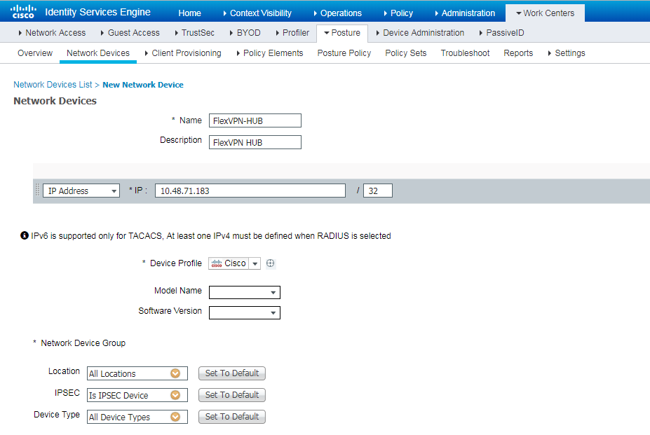 Schritt 1: Gehen Sie zu Work Centers -> Posture -> Network Devices, und klicken Sie auf Add.
