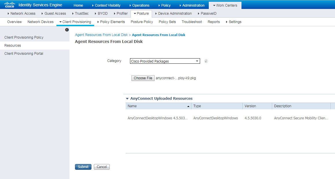 Schritt 2: Um AC-Pakete in die ISE hochzuladen, navigieren Sie zu Work Centers -> Posture -> Client Provisioning -> Resources, und klicken Sie auf Add. Wählen Sie Agent-Ressourcen von der lokalen Festplatte aus. Wählen Sie im neuen Fenster Cisco Provided Packages (Von Cisco bereitgestellte Pakete) aus, klicken Sie auf Choose File (Datei auswählen) und wählen Sie AC Package (AC-Paket) auf Ihrem PC aus.