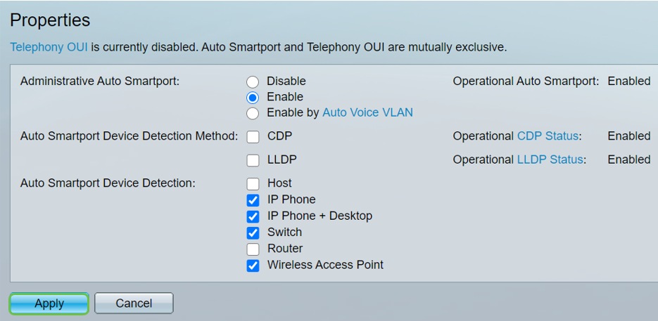 Wählen Sie Disable (Deaktivieren) neben Administrative Auto Smartport, um den Smartport global auf dem Switch zu deaktivieren. Klicken Sie auf Apply (Anwenden).