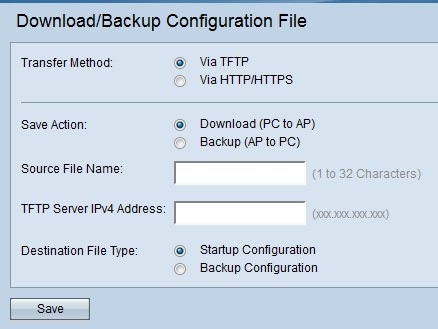 Führen Sie die unten aufgeführten Schritte aus, um die Konfigurationsdatei über TFTP zu sichern. TFTP ist eine vereinfachte, nicht sichere Version des File Transfer Protocol (FTP). Es wird hauptsächlich zur Aktualisierung/Sicherung von Firmware und zur Verteilung von Software zwischen Unternehmensnetzwerken verwendet. TFTP verfügt über eine Server- und Client-Konfiguration. WAP fungiert als TFTP-Client.