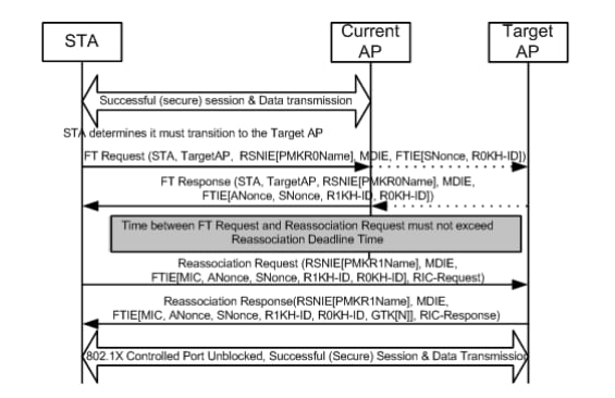 Sobald der Client beschließt, zu einem besseren Access Point wechseln zu können, sendet er einen FT Action Request Frame an den ursprünglichen Access Point, mit dem er derzeit verbunden ist, bevor er zum Roaming wechselt. Der Client gibt die BSSID (MAC-Adresse) des Ziel-AP an, in dem er Roaming betreiben möchte. Der ursprüngliche WAP leitet diesen FT Action Request Frame über das Verteilersystem (in der Regel die verkabelte Infrastruktur) an den Ziel-WAP weiter, und der Ziel-WAP antwortet dem Client mit einem FT Action Response Frame (auch über den DS, sodass er ihn schließlich drahtlos an den Client senden kann). Sobald dieser FT Action Frame Exchange erfolgreich abgeschlossen wurde, schließt der Client das FT-Roaming ab. Der Client sendet die Neuzuordnungsanforderung an den Ziel-WAP (diesmal drahtlos) und erhält eine Neuzuordnungsanforderung vom neuen WAP, um die Roaming- und die endgültige Schlüsselableitung zu bestätigen.