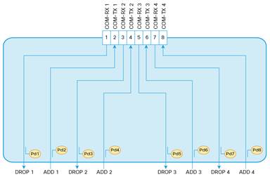 The 4x4 colorless omnidirectional flex spectrum (COFS) add-drop module (product number: NCS2K-MF-4X4-COFS-AD) is a passive unit consisting of eight 2 x 2 optical couplers and eight photodiodes, arranged as shown in Figure 9. This module is single-slot height in the mechanical frame chassis. Power monitoring is present at each channel input port and at each common input port. Virtual photodiodes are implemented on the channel drop ports by subtracting the insertion losses from the photodiode reading on the COM-RX ports. Power values, as well as the manufacturing data stored in the flash memory, are provided to Cisco Transport Controller through the USB connection. The module’s primary function is to provide optical multiplexing and demultiplexing for up to four optical signals. Because it is based on optical splitter and combiner technology, only transceivers employing coherent detection can be directly connected to four client ports of this unit.