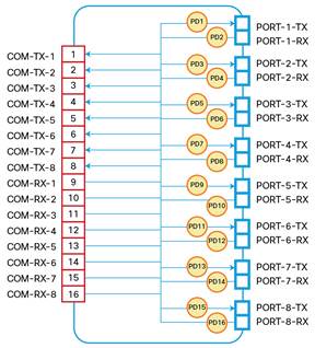 The MPO-16 to 16 x LC Fan-Out Module provides mechanical adaptation from units offering LC connectors to those with MPO-16 connectors. A total of sixteen photodiodes provide power monitoring of input and output ports, as shown in Figure 12.