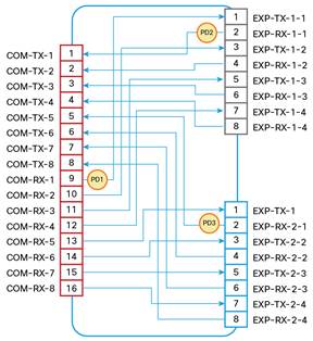 The MPO-16 to 2 x MPO-8 adapter module provides mechanical adaptation from units offering MPO-8 connectors to those with MPO-16 connectors. Two adaptations are provided per module. Three photodiodes provide power monitoring of input and output ports, as shown in Figure 13.
