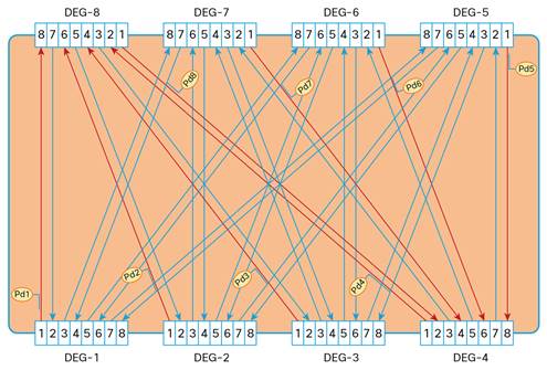 The Cisco 4-Degree Upgrade Modular Patch Panel Module provides interconnections among eight 8-fiber MPO connectors. It is used to expand the number of degrees and the number of add-drop ports supported by the node. The 64 optical paths are interconnected as shown in Figure 5. A total of eight photodiodes provide power monitoring of fiber 1 of each MPO connector. Power values, as well as the manufacturing data stored in the flash memory, are provided to Cisco Transport Controller through the USB connection. This module is single-slot height in the mechanical frame chassis.