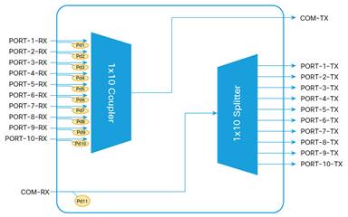 The 1 x 10 colorless flex spectrum (CFS) add-drop module (product number: NCS2K-MF-10AD-CFS) is a passive unit with one 1 x 10 splitter and one 10 x 1 combiner, plus 11 photodiodes arranged as shown in Figure 8. This module is double-slot height (full height) in the mechanical frame chassis. Its primary function is to provide optical multiplexing and demultiplexing for up to 10 optical signals. Because it is based on optical splitter and combiner technology, only transceivers employing coherent detection can be directly connected to the 10 client ports of the unit. Integrated photodiodes provide connectivity check and monitoring functions. Virtual photodiodes are implemented on the drop ports by subtracting the insertion losses from the photodiode reading on the COM-RX port. Power values, as well as the manufacturing data stored in the flash memory, are provided to Cisco Transport Controller through the USB connection.