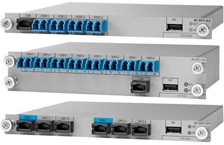 A set of adapter modules converts between MPO-8, MPO-16, and LC fiber connectors. The following adapter modules are available: