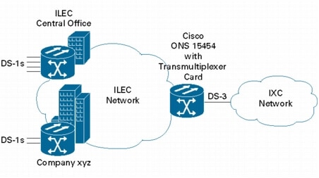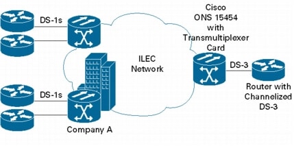 The Cisco ONS 15454 12-Port DS-3 Transmultiplexer Card can be used in a variety of applications. The channelized DS-3 is a very popular intercarrier hand-off between two service providers (Figure 2) because it allows the aggregation of many lower-bandwidth, leased-line DS-1 services to a single, consolidated interface, reducing cabling complexity. The 12-port DS-3 transmultiplexer card's high port density allows the service provider to deploy fewer cards and chassis, reducing central-office footprint, power, and technician complexity.
