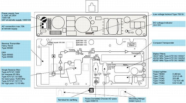8. Below 40 MHz, above 40 MHz decreasing with 1.5 dB/octave with LP-link 77099. Reverse output return loss ≧18 dB at 40 MHz decreasing with -1.5 dB/octave, the return path being equipped with optional reverse filter A73127.xxxx and diplex filter A75130.XXXX.