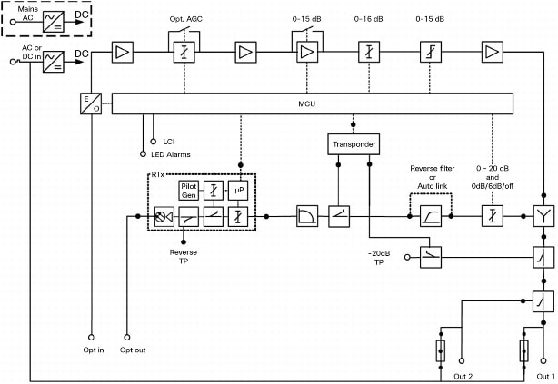 • Integrated three-state reverse switch (on/-6 dB/off) that allows the reverse input to be isolated for noise and ingress troubleshooting