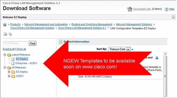 This link takes you directly to the cisco.com page, where all prebuilt LMS templates are listed. There will be a folder for NGEW in the near future (as shown in the following screenshot) where templates for pretested NGEW configurations can be downloaded.