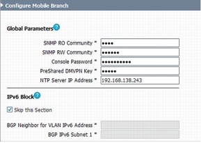 The next step generates the branch-office configuration. You may need to complete multiple configuration fields within the template. The wizard will prompt you for all information that needs to be unique for this network or a particular device using this template. Grouping of sections helps you quickly enter relevant information. Enter all of the parameters broken down by section.