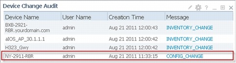 Change management, simply put, refers to retrieving information from the network in real time. These changes could be caused by replacing the device, modules, or cards within the device or other accessories within the device. Upgrading the device software or changing the device configuration would also contribute to a change that is worth tracking. You can easily track all of these changes with Cisco Prime LMS, which includes portlets that automate the task of tracking all types of change audits within the network. The following screenshot shows how you can track Inventory and Configuration audits using one of the portlets in Cisco Prime LMS:
