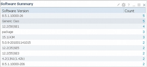 Having a chart for software images running on network devices also has its own significance. Clicking the number at the right in the screenshot that follows allows access to information similar to that of the hardware inventory. Having a table of all software versions allows you to baseline the network and to quickly spot any devices not running a standardized image.