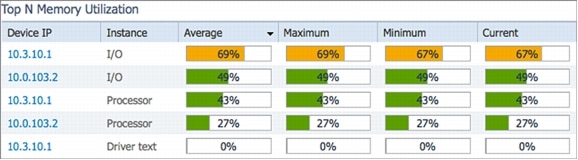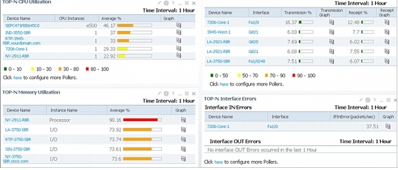 The Monitoring dashboard is populated with the Top-N portlets for quickly spotting problems. Cisco Prime LMS has the Top-N portlets for CPU, memory, interface, errors, environmental, and other important statistics to help troubleshoot problems.