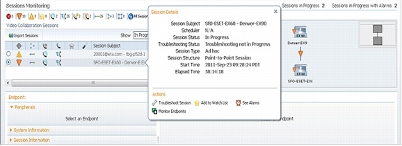 Monitor > Session Monitoring to see the sessions that are in progress in the network. In the screen shot below you can see a video session between Tandberg EX-60 and EX-90.