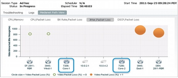 Medianet Path View to instantly see all the intermediate devices on the x-axis. Various other parameters such as CPU, memory, packet loss, and jitter are plotted on the y-axis. The size of the bubble indicates the magnitude of the second variable of the tab. For example, in the screenshot note that jitter is indicated by the y-axis, whereas the size of the bubble indicates packet loss.