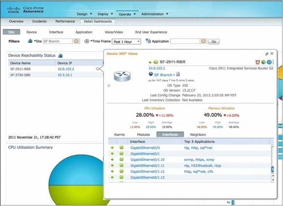 Cisco Prime Assurance Manager 1.1 also includes 360 degree views for devices. This further enables effective troubleshooting by bringing together all the device information like health, alarms, events, top application traffic on interfaces, etc into a single view. The troubleshooting context, in this case the site view, is maintained while viewing device specific information in the 360 degree window. As an example this enables the user to correlate the alarms with the configuration change, or identify which are the critical interfaces depending on which applications flow through them.