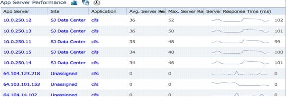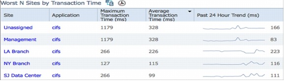 The Cisco Prime Assurance Manager can also provide end-to-end visibility into application health. The Application dashboard shows the sites having the worst experience for the application, cifs in this case. It also shows the health of the application servers, the top users of this application, the application usage trend and tools to further analyze and troubleshoot the application response time (ART).