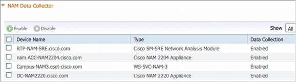 Cisco Prime Network Analysis Module (NAM). The NAM can analyze live traffic streams and provide packet analysis capabilities for advanced troubleshooting. For visibility into WAN Optimized environments, the NAM collects information from the Cisco Wide Area Application Services (WAAS) Flow Agent (FA) and the Cisco IOS