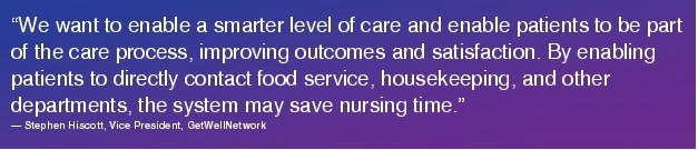 GetWellNetwork is a private company that provides healthcare services to 1.2 million patients with a focus on patient engagement. It utilizes a combination of patient devices (e.g., touch screen accessible from bed) and web-based clinical tools with information delivered over a secure network to improve services and outcomes; in its words, it focuses on "interoperability at the point of care." It has developed a unique patient experience application for the hospital industry aimed at improving the overall care process and actual outcomes.