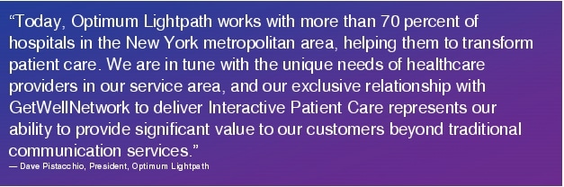 • In May 2009, Optimum Lightpath announced a partnership with GetWellNetwork to offer its patient/healthcare software in Cablevision's franchise region. This partnership enables Cablevision to sell its video services to hospitals and support GetWellNetwork's patient program. Optimum Lightpath and GetWellNetwork plan to fully leverage their first mover advantage for patient applications and services.