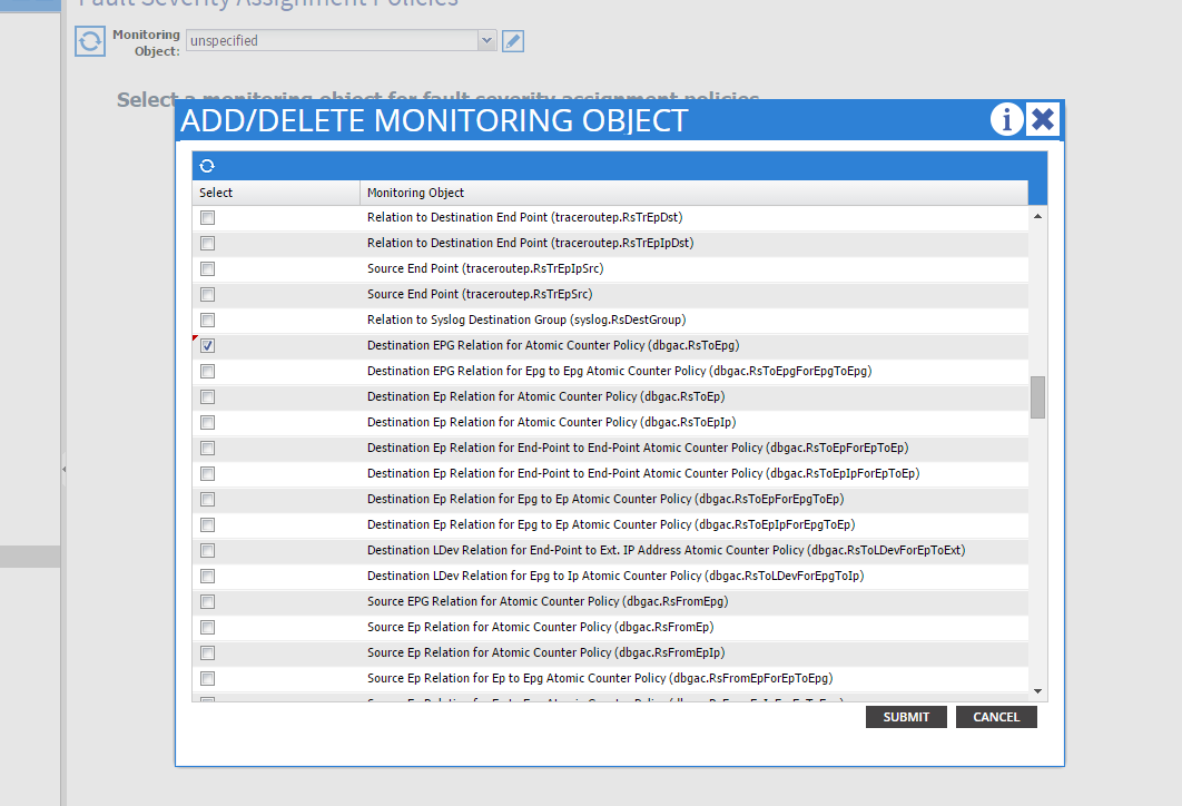 Then, if you choose in the monitoring object list of that monitoring policy, the class for which the fault was created (here dbgac.RsToEpg).