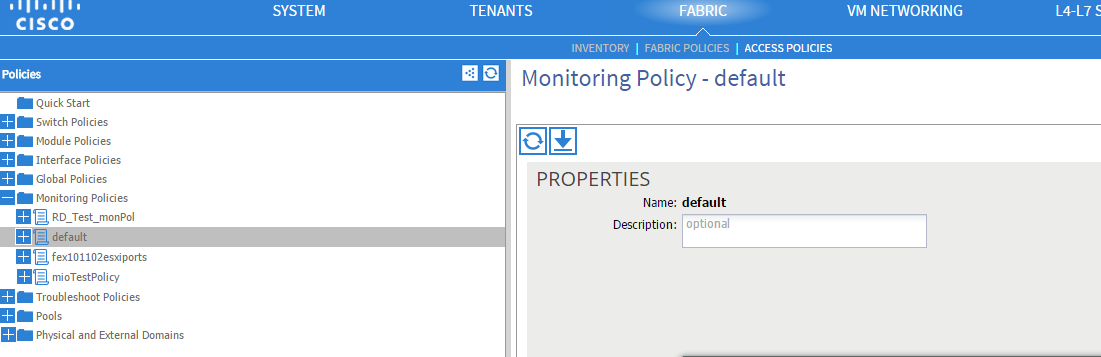 - monFabricPol - deals with fabric monitoring - located in Fabric > Fabric Policies > Monitoring policies