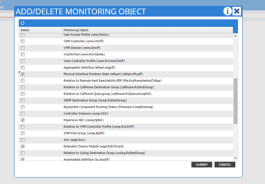 - Each MO in the tree that can generate faults has an attribute monPolDn which points to another MO which is a monitoring policy object. This object allows the property to be modified and the trigger to generate faults. There are multiple classes of the monitoring policy object, such as: