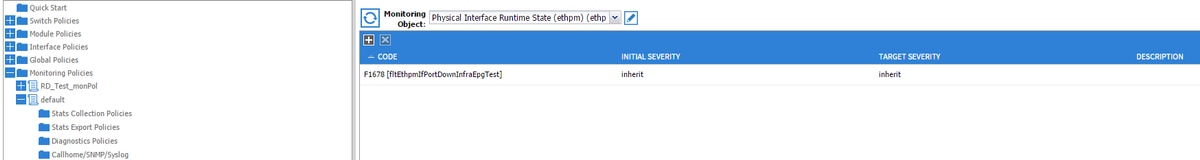 Under the Fault Severity Assignment policy, click the pencil in the work pane, next to the monitoring object drop-down list. Add a class where you modify the monitoring properties. Then choose the class of the object that generated the fault, that is, ethmPhysIf.