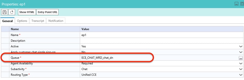 1. Ensure that appropriate Queue is selected for chat entry point. Navigate to Partition Administration (PA) page > Departments > Service > Entry Points , select the entry point created for chat, and then review the value of Queue selected as shown in the image;