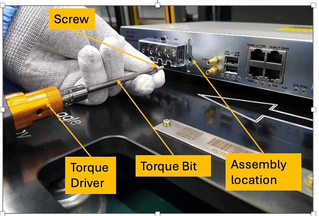 Cisco recommends properly installing the screws so that the routers can withstand 4KV Common Mode Voltage. The screw location is on the front panel of the router, as shown in the picture. Only one screw is required per affected device. Cisco recommends using only the Cisco-provided screwdriver, which is set to deliver a maximum torque of 0.5Nm.