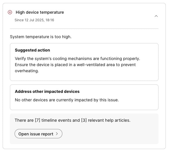 The following image is an example of a high device temperature warning shown in Webex Control Hub: