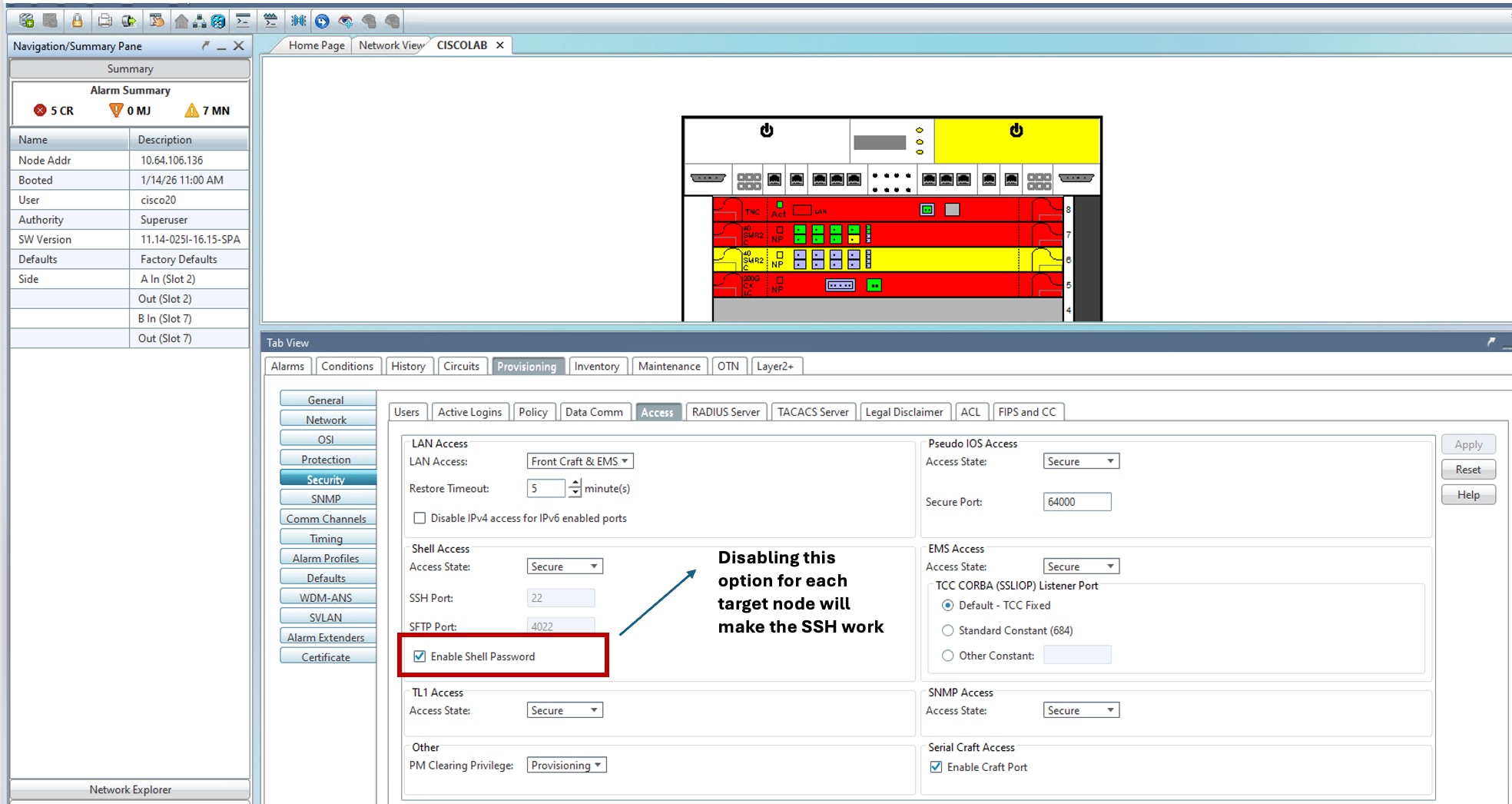 After upgrading Cisco NCS2K Series nodes that are configured for Shell Access with the Access State set to Secure and the Enable Shell Password option enabled to Release 11.14, users are unable to SSH into the shell of the node. During SSH login attempts, the system prompts for the SSH password. However, even when the correct password is entered, the system does not prompt for the shell password and access to the shell is not granted.