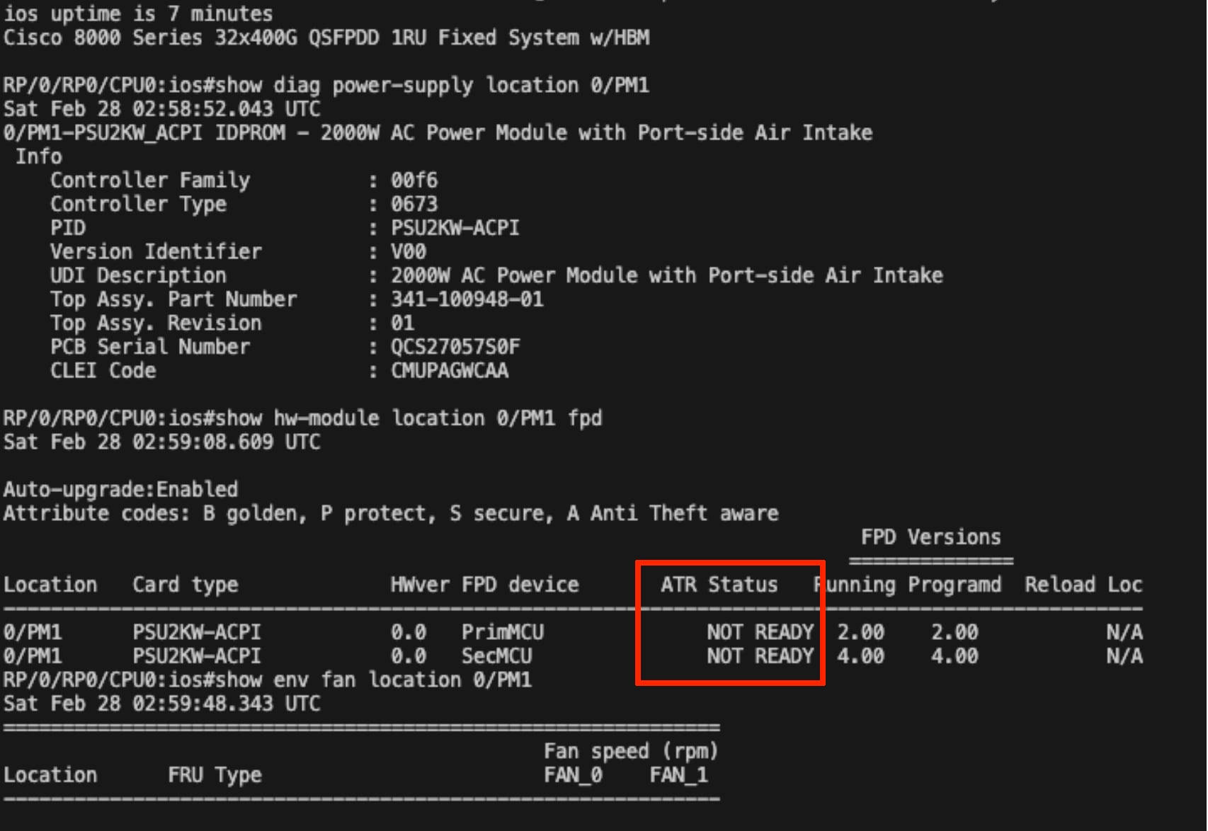 Run show hw fpd. The status for a single-fan PSU (typically PM0 or PM1) will display NOT READY, as shown in the following example: