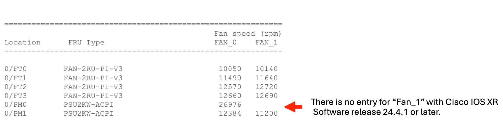 Note: When the system is running Cisco IOS XR Software Release 24.4.1 or later or recommended SMUs are loaded, the FAN_1 entry is correctly omitted, and no alarm or false output is generated, as shown in the following example: