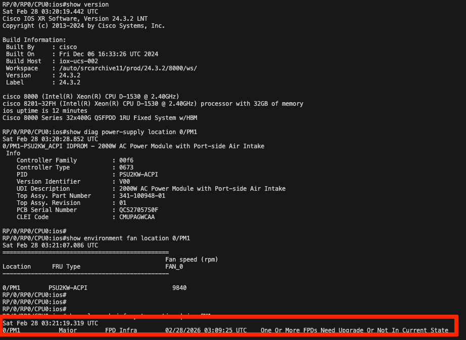 Use show env fan and show hw fpd to verify the issue. The following output examples are for Cisco IOS XR Software releases earlier than 24.4.1.