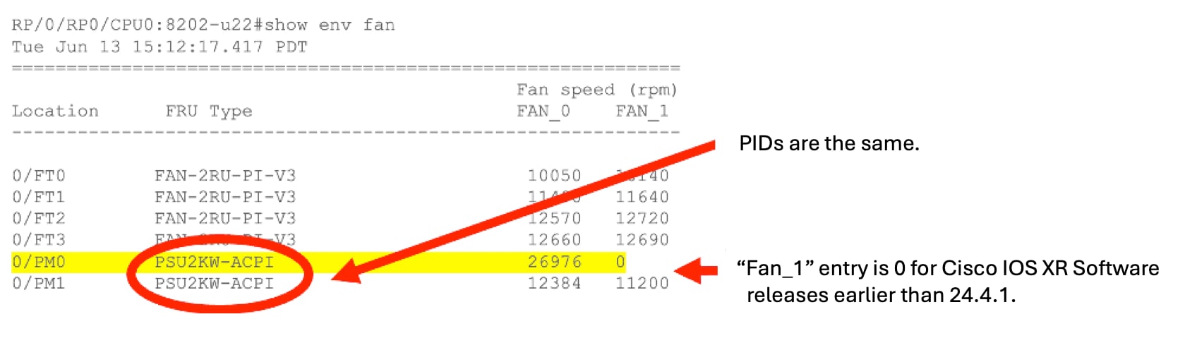 Cisco IOS XR Software images from releases earlier than Release 24.4.1 do not differentiate between these hardware versions and expect two fans for all units, resulting in a field-programmable device (FPD) alarm for the fan and firmware upgrade limitations on new PSUs.