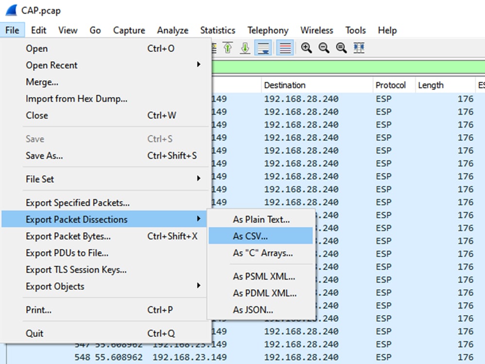 Navigate to File > Export Packet Dissections > As CSVā¦