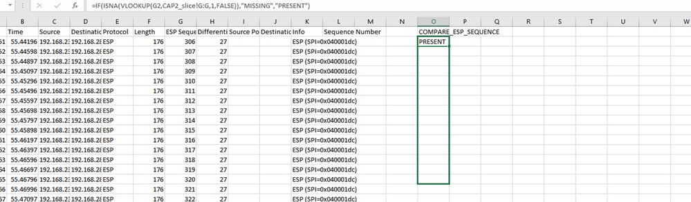 When the dropdown menu is selected on the COMPARE_ESP_SEQUENCE column, now it is seen that there are MISSING packets also. This can be toggled to view only the MISSING packets.