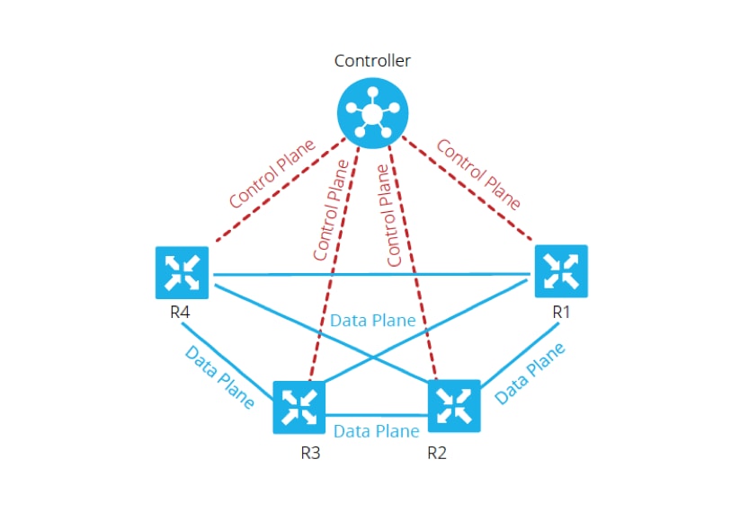 In this example, R1 and R4 have no pairwise adjacency just the data plane path. Therefore, the central controller easily controls and modifies traffic flow. For example, it can control all the prefixes from R1 that are advertised to R4 via R3, or that certain prefixes are advertised to R4 via R3, while certain are advertised directly from R1, where R3 could be a point of application for a firewall policy. This approach dramatically reduces the volume of data plane policies that would need to be implemented at each router, with the use of traditional networking topologies. SD-WAN is an overlay network which can help admins identify critical traffic and give it special treatment throughout the network.