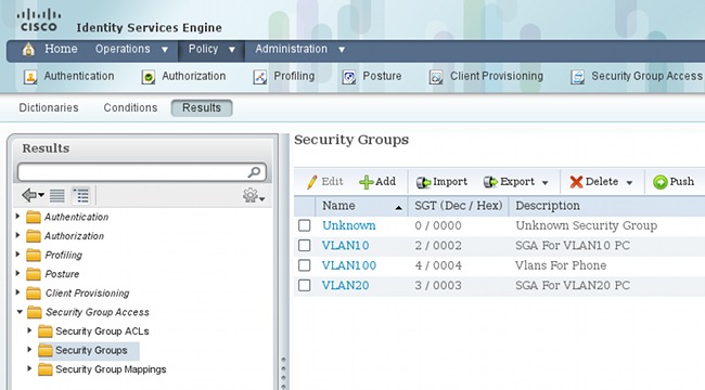 In order to configure the SGT groups (tags) on ISE, navigate to Policy > Results > Security Group Access > Security Groups.