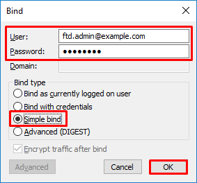 5. Select Simple Bind then specify the Directory Account User and Password. Click OK.