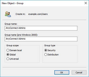 In this example, the group AnyConnect Admins are added under the Users container. Right-click Users, then navigate to New > Group.