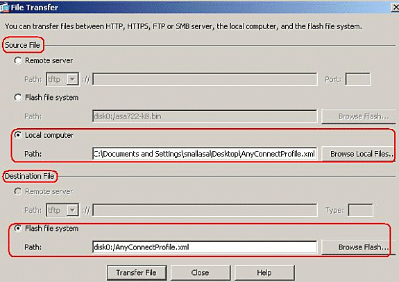 In order to transfer the profile from the local computer to ASA Flash memory, choose the Source File, path of the XML file (local computer), and the Destination File path as per your requirement.