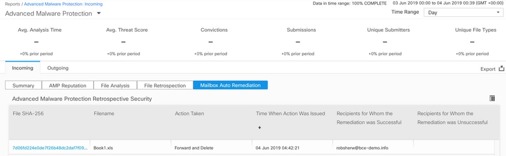 Reporting for any SHA256 that has been remediated will be in the Mailbox Auto Remediation report available both on the Cisco Secure Email gateway and Cisco Secure Email and Web Manager.