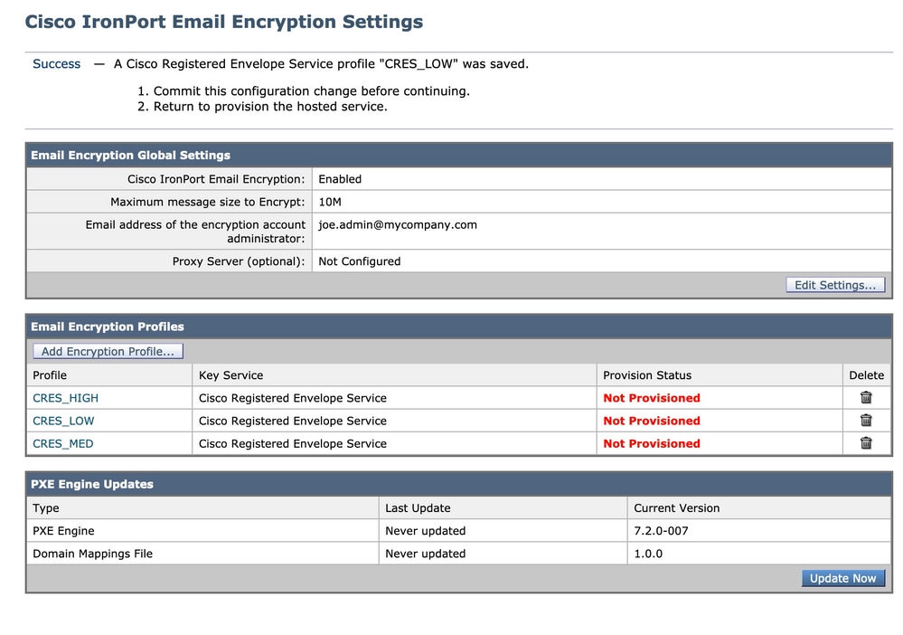 Once provisioning is completed, your Cisco IronPort Email Encryption page will show the profile as provisioned.