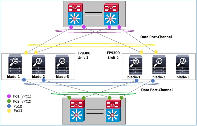 For example, in the case of FP9300 (2 chassis, 6 blades) the data ports can be configured like this: